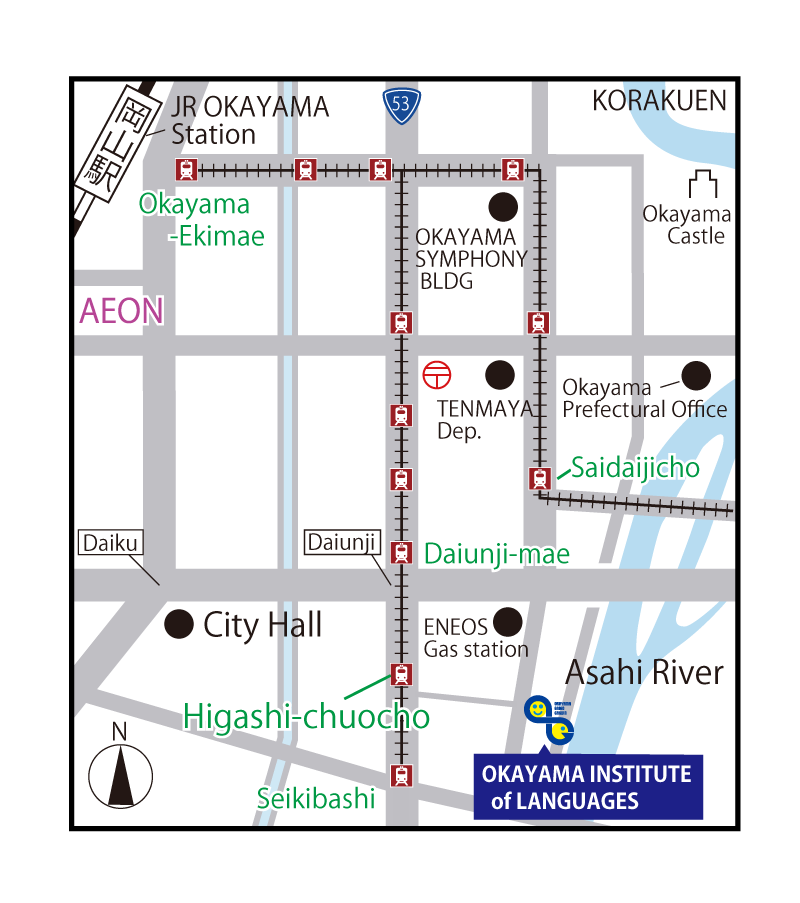 →Từ ga Okayama xe điện romen/tuyến Seikibashi (lên trạm số 2) xuống ở trạm "Higashi chuoucho", mất khoảng 15 phút.